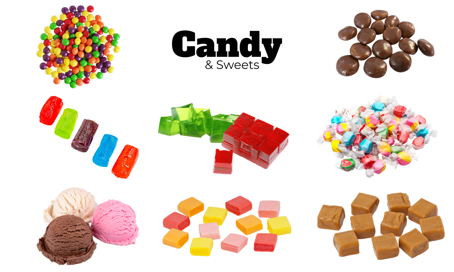 π Rainbow Rounds π Fruit Airs π« Cocamel Bites βοΈ Frost Drops β‘ Sour Sparks π Jiggly Gems π¬ Crunch Blasts π Taffy Balls πΆ Caramel Cores